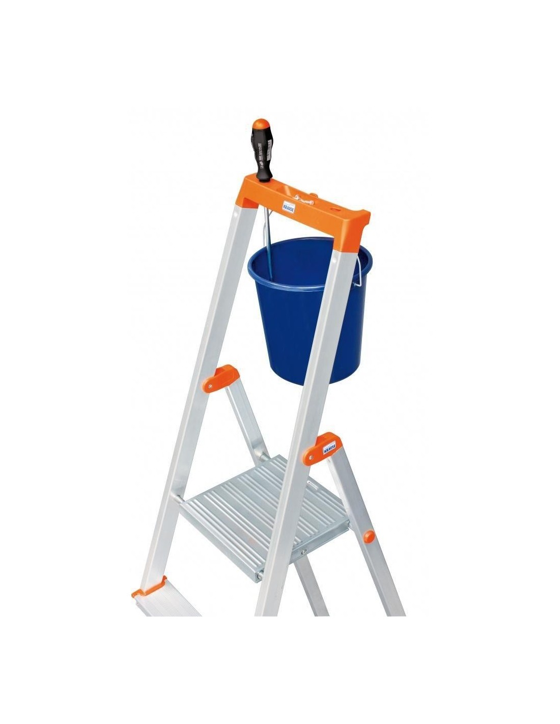 Stabil és praktikus lépcsőfokos állólétra kisméretű tárolófelülettel és vödörtartóval a legkülönbözőbb beltéri munkákhoz.