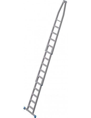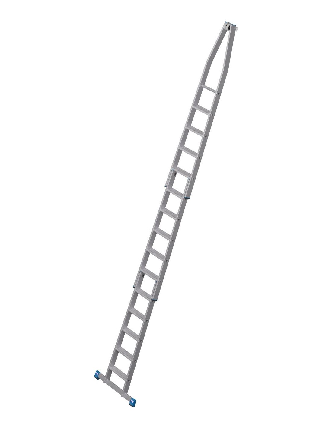 A létra felső tagja fali vezetőgörgőkkel és kopásálló, puha gumi anyagú érintkező blokkal, ékkivágással, mely házsarkakra és ablakprofilokra helyezhető