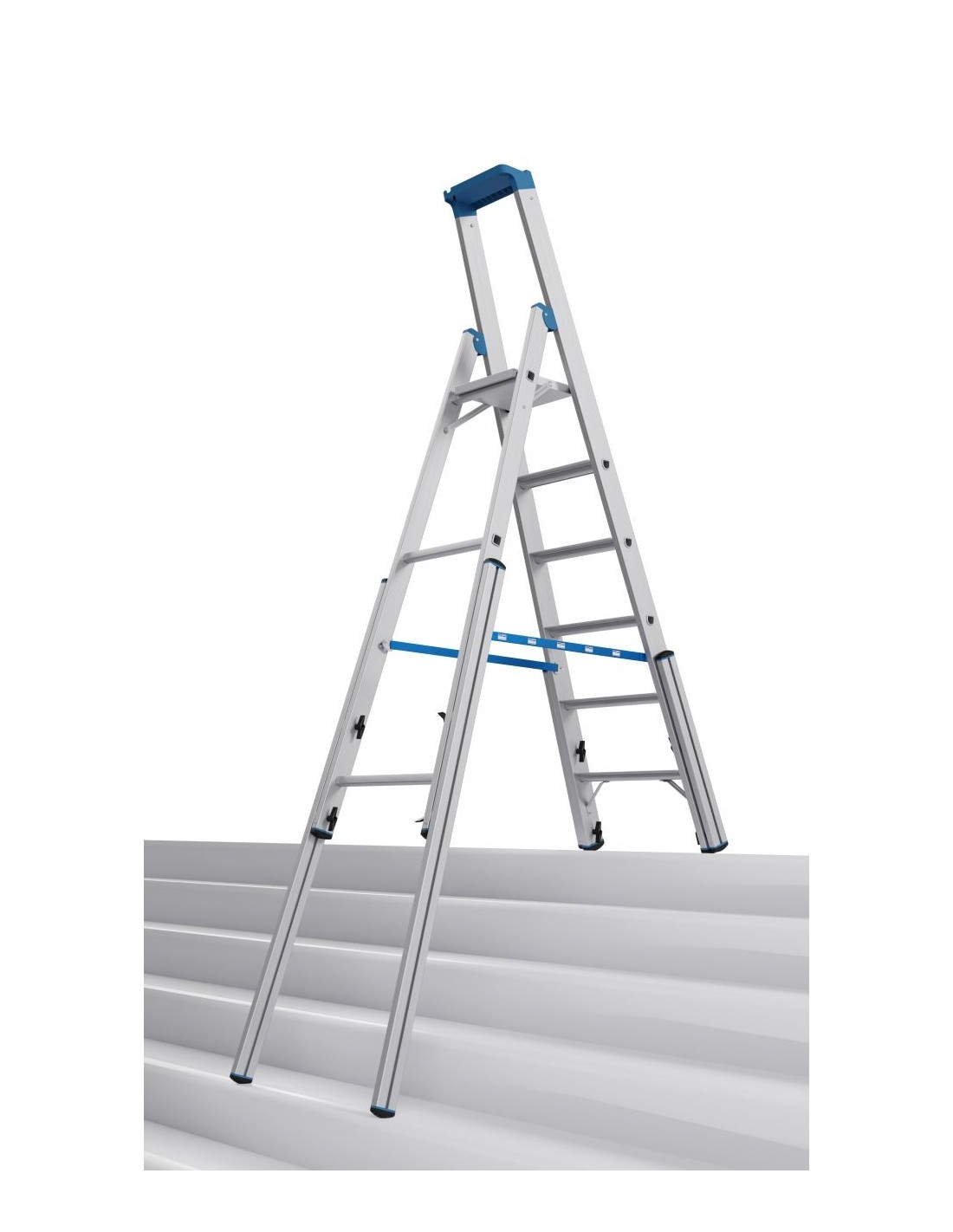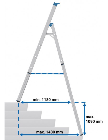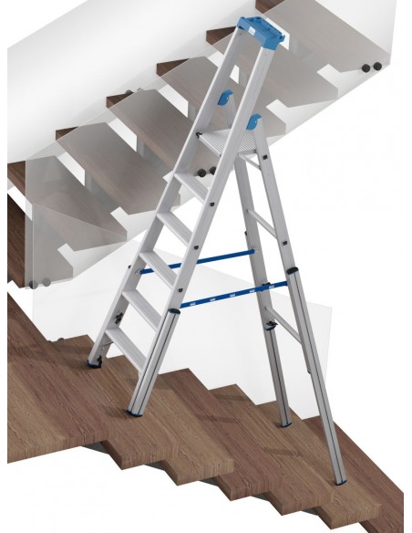 Robusztus, egy oldalon járható alumínium teleszkópos létra 4 szárhosszabbítóval professzionális használatra lépcsőkön, sarkokban, emelvényeken és hasonló magasságkülönbségek esetén.