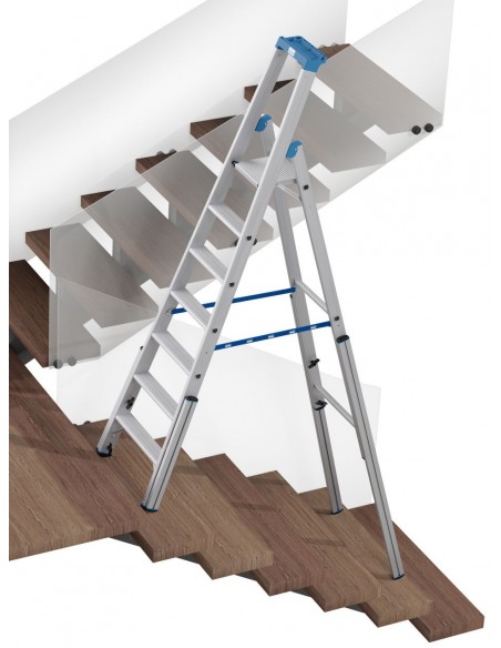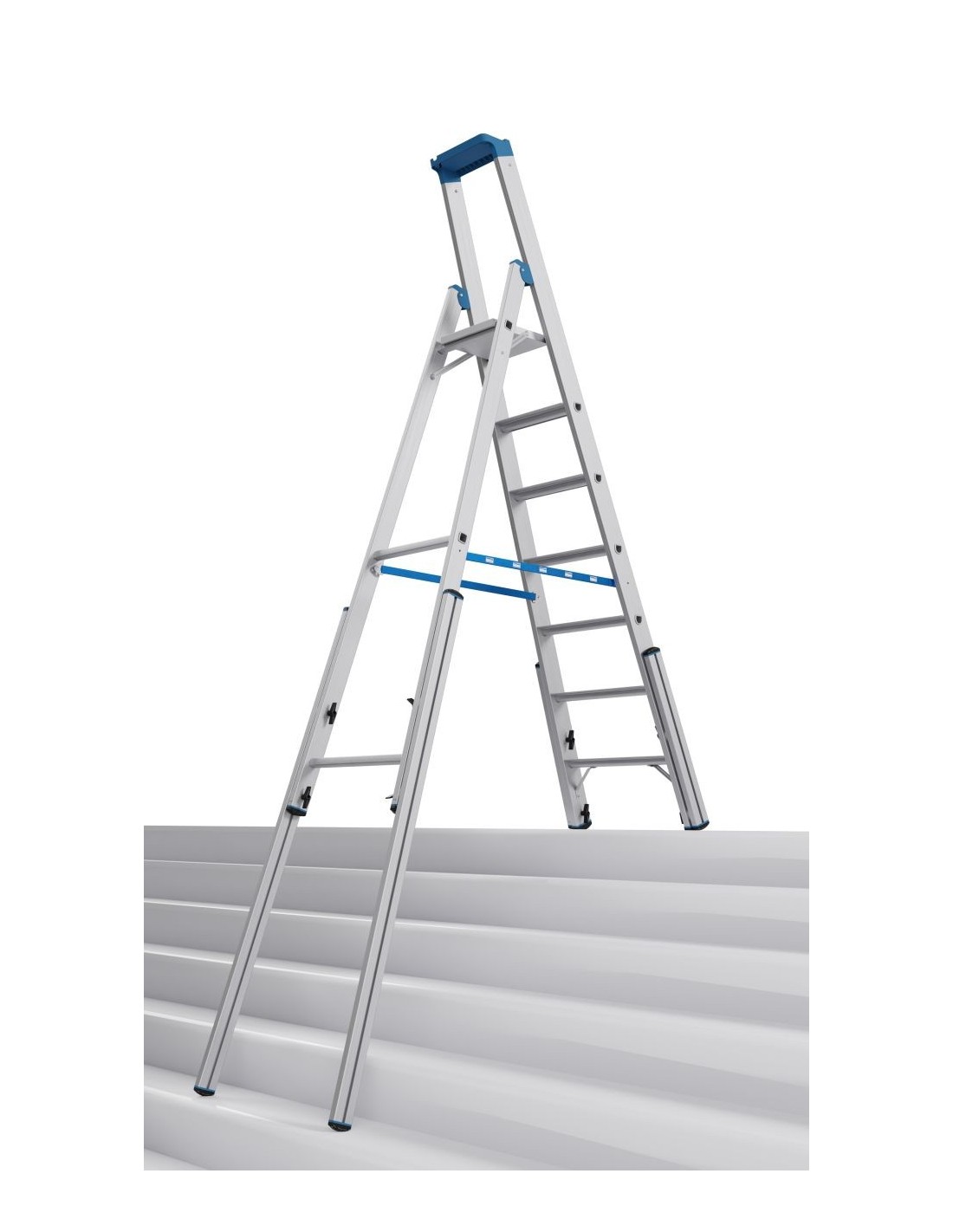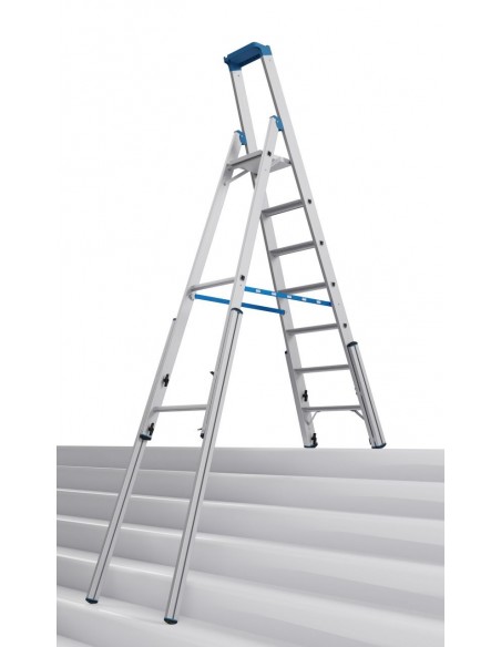 Robusztus, egy oldalon járható alumínium teleszkópos létra 4 szárhosszabbítóval professzionális használatra lépcsőkön, sarkokban, emelvényeken és hasonló magasságkülönbségek esetén.