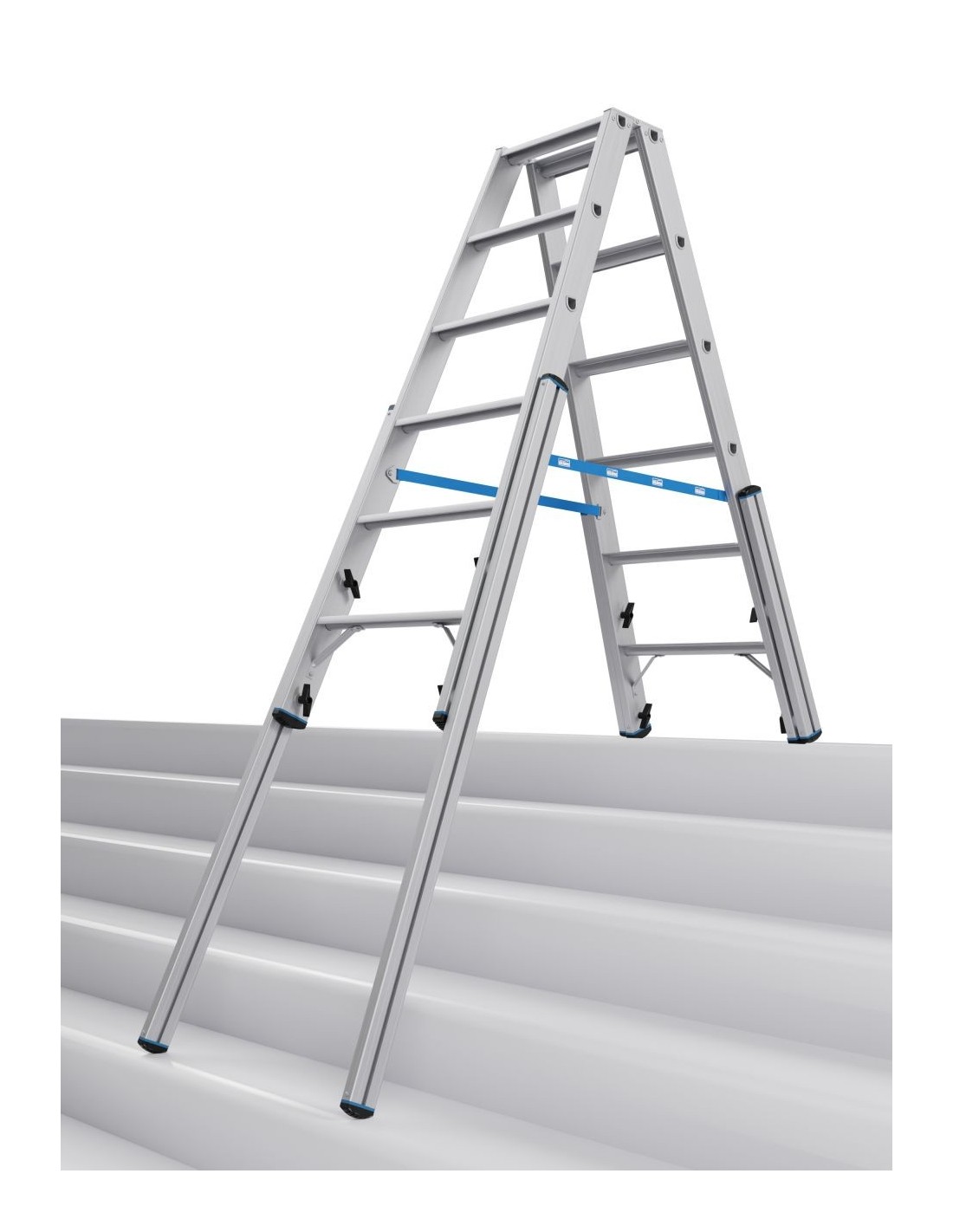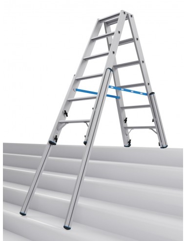 Ez a professzionális használatra kifejlesztett alumínium teleszkópos két oldalon járható létra lépcsőfunkcióval nagy stabilitást biztosít még lépcsőkön, sarkokban, emelvényeken és hasonló magasságkülönbségek esetén történő használat során is.